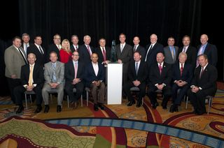 Partnership Circle Award Winners. Pictured: back row, L to R: Jonathan Bogatay, The North Central Group; David Lenz, The North Central Group; David Cocco, Kratsa Properties; Bill Kratsa, Kratsa Properties; Aimee Fyke, Tharaldson Hospitality Management; Liam Brown, Marriott International; Bob McCarthy, Marriott International; Gary Tharaldson, Tharaldson Hospitality Management, Arne Sorenson, Marriott International; Dave Grissen, Marriott International; Craig Lambert, Inland American Lodging Advisor, Inc.; Keith Osborn, The North Central Group; Plato Ghinos, Shaner Hotel Group; Lance Shaner, Shaner Hotel Group – front row, L to R: Paul Welker, Sunridge Hotel Group; Brian Welker, Sunridge Hotel Group; Tommy Nigro, Stonebridge Companies; Navin Dimond, Stonebridge Companies; Marcel Verbaas, Inland American Lodging Advisor, Inc.; Brad Wiens, True North Hotel Group, Inc.; Lew Wiens, True North Hotel Group, Inc.; Dick Merkel, True North Hotel Group, Inc.]