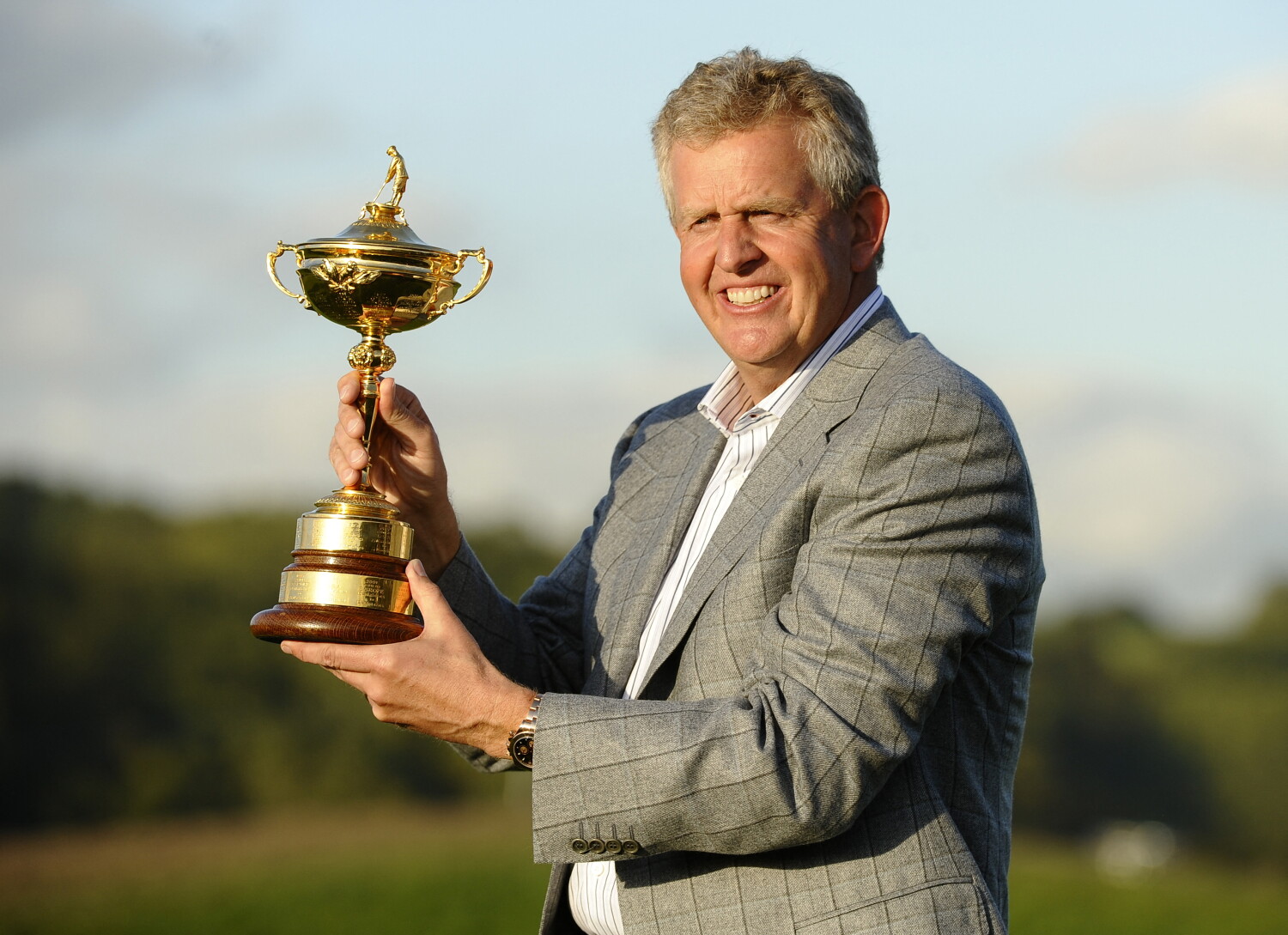 Europe Ryder Cup captain Colin Montgomerie poses for pictures wth the Ryder Cup after Europe beat the US by 14 1/2 points to 13 1/2 points on the final day of the 2010 Ryder Cup golf competition at Celtic Manor golf course in Newport, Wales on October 4, 2010. AFP PHOTO/TIMOTHY A. CLARY (Photo by TIMOTHY A. CLARY / AFP via Getty Images)