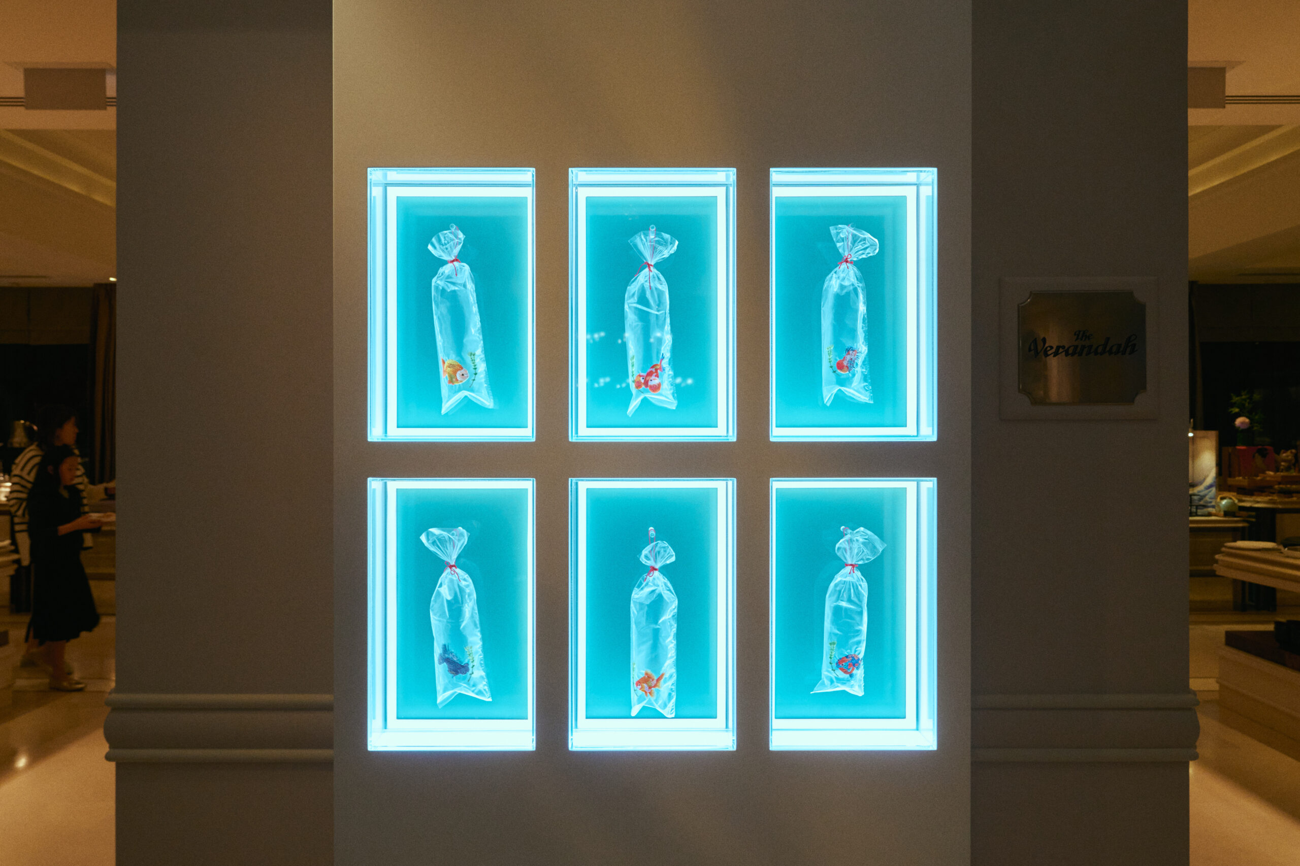 The exterior of the hotel is animated by Angel Hui’s installation Swimming in Light, which introduces her signature embroidered goldfish motif across the building’s windows and awnings. The work reimagines everyday visual elements through light, colour, and motion, creating a dynamic visual dialogue between the hotel and the surrounding cityscape.